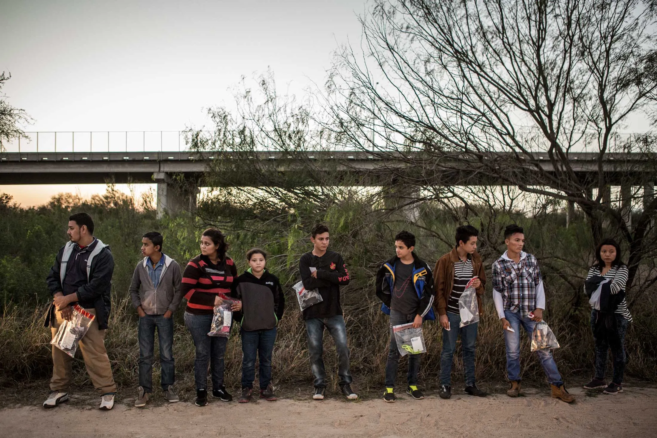 移民在安萨尔杜阿斯国际桥旁排队,等待海关和边境保护局的执法人员处理。因为墙和河之间必须有一些美国的土地,来自南方的人们总会有地方可以走去以便被故意拘留。去年,有137,000名家庭成员和无陪伴儿童越过西南边界,比前一年约80,000人有所增加。其中几乎所有人都来自萨尔瓦多、危地马拉和洪都拉斯。摄影师:Kirsten Luce 为《彭博商业周刊》拍摄