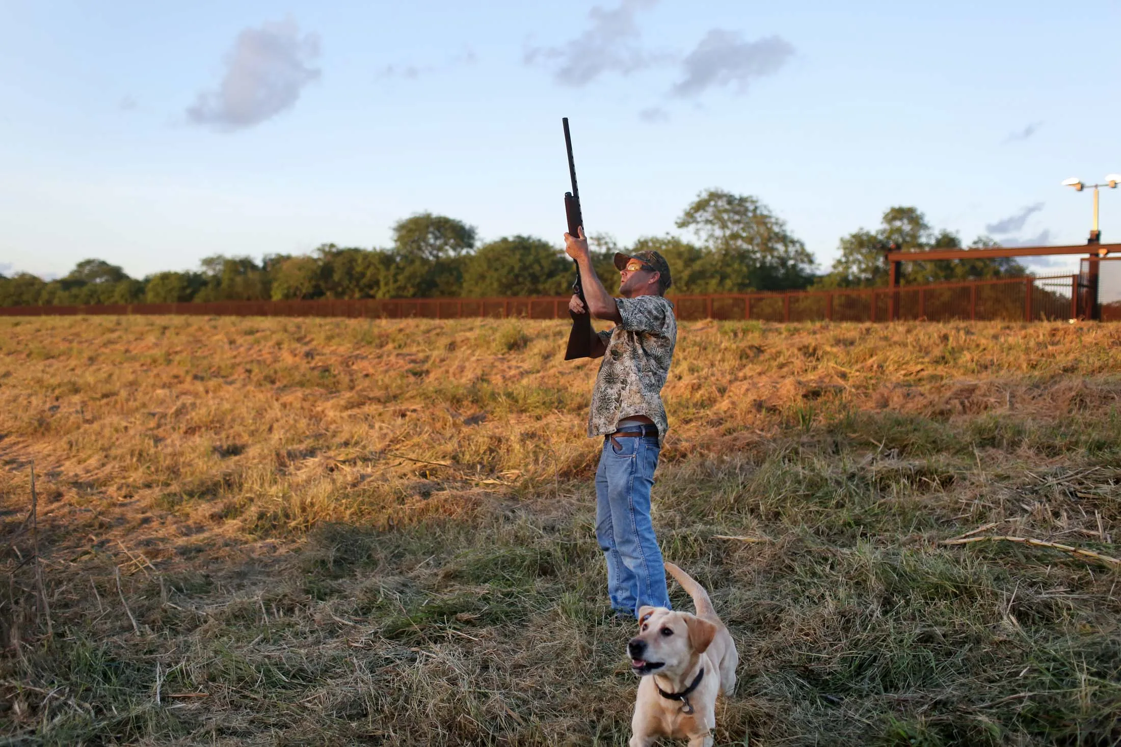 大卫·福克斯和他的狗杰西·詹姆斯在布朗斯维尔达米安·马瑟斯拥有的私人土地上猎捕鸽子。在建造围栏时,政府给了一些土地所有者自己的大门(马瑟斯的大门在背景中)。摄影师:Kirsten Luce 为《彭博商业周刊》拍摄