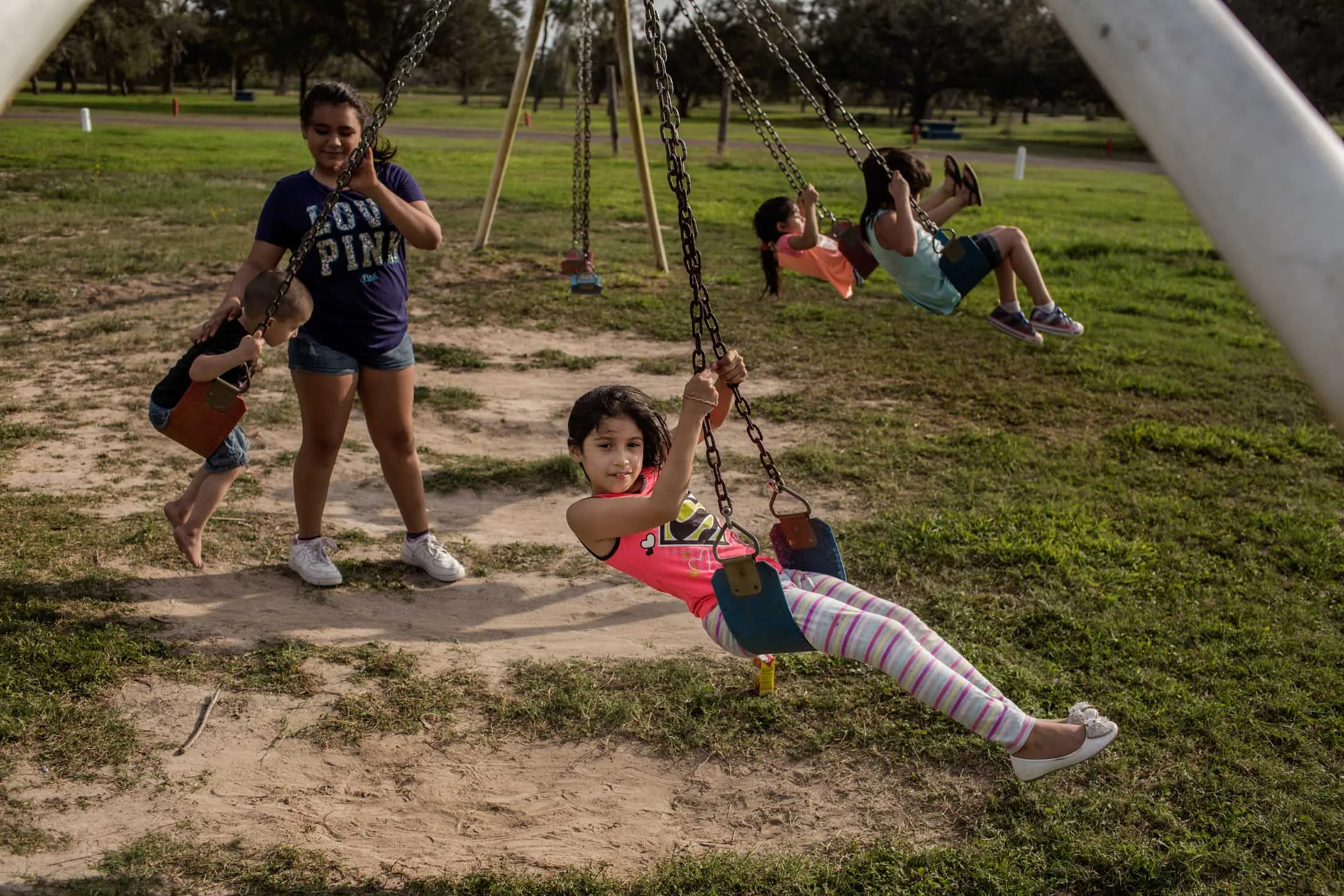 德克萨斯州米申的8岁阿里亚娜·里奥斯(中)在边界墙南侧的安萨尔杜亚斯公园与表兄弟玩耍。这个公共游乐场过去从日出开放到日落,但现在因为中美洲毒品暴力导致的移民涌入而在下午5点关闭。他们通常由控制该边境地区墨西哥一侧的泽塔斯毒贩运送,通常在晚上到达这里。寻求庇护者向执法人员自首,希望能获得律师和保护。边境官员希望清理公园内的城镇居民,以减少混乱。摄影师:Kirsten Luce 为《彭博商业周刊》拍摄
