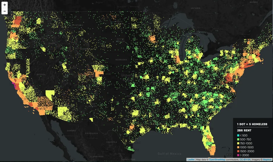 为了使可负担住房不足与无家可归之间的关联更加明显,这里是叠加了两居室公寓平均租金的点图。看看旧金山的明显热点: