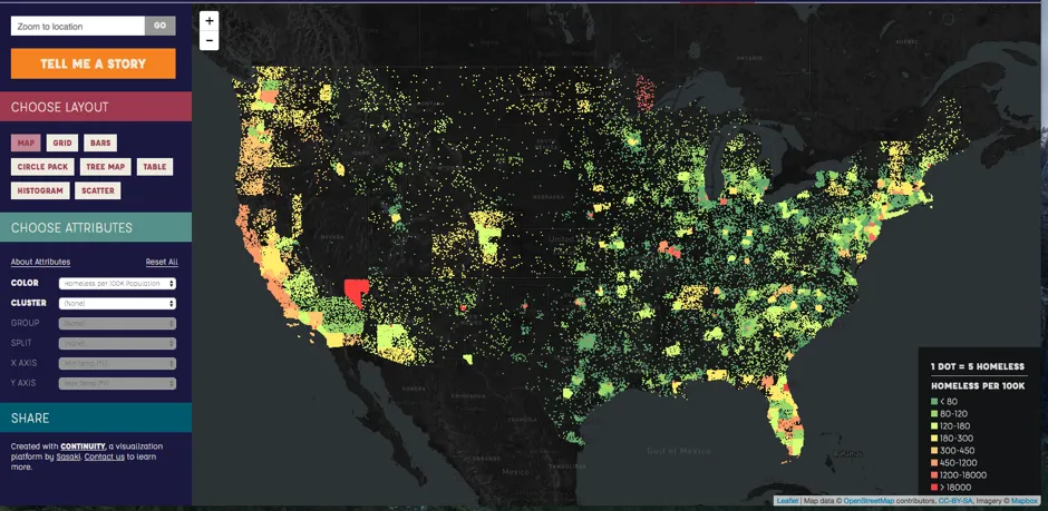 如果特朗普政府提议的预算削减成为现实,美国的无家可归者人数 可能会上升 到近30年来未见的水平。这令人担忧,因为在美国许多地方,这个问题已经顽固地存在,基勒项目的第二部分对此进行了支持。除了其他可视化内容外,它还包括 基于政府数据的美国无家可归者人口的互动点图,按地区、州和县分类。一个点代表五个人:
