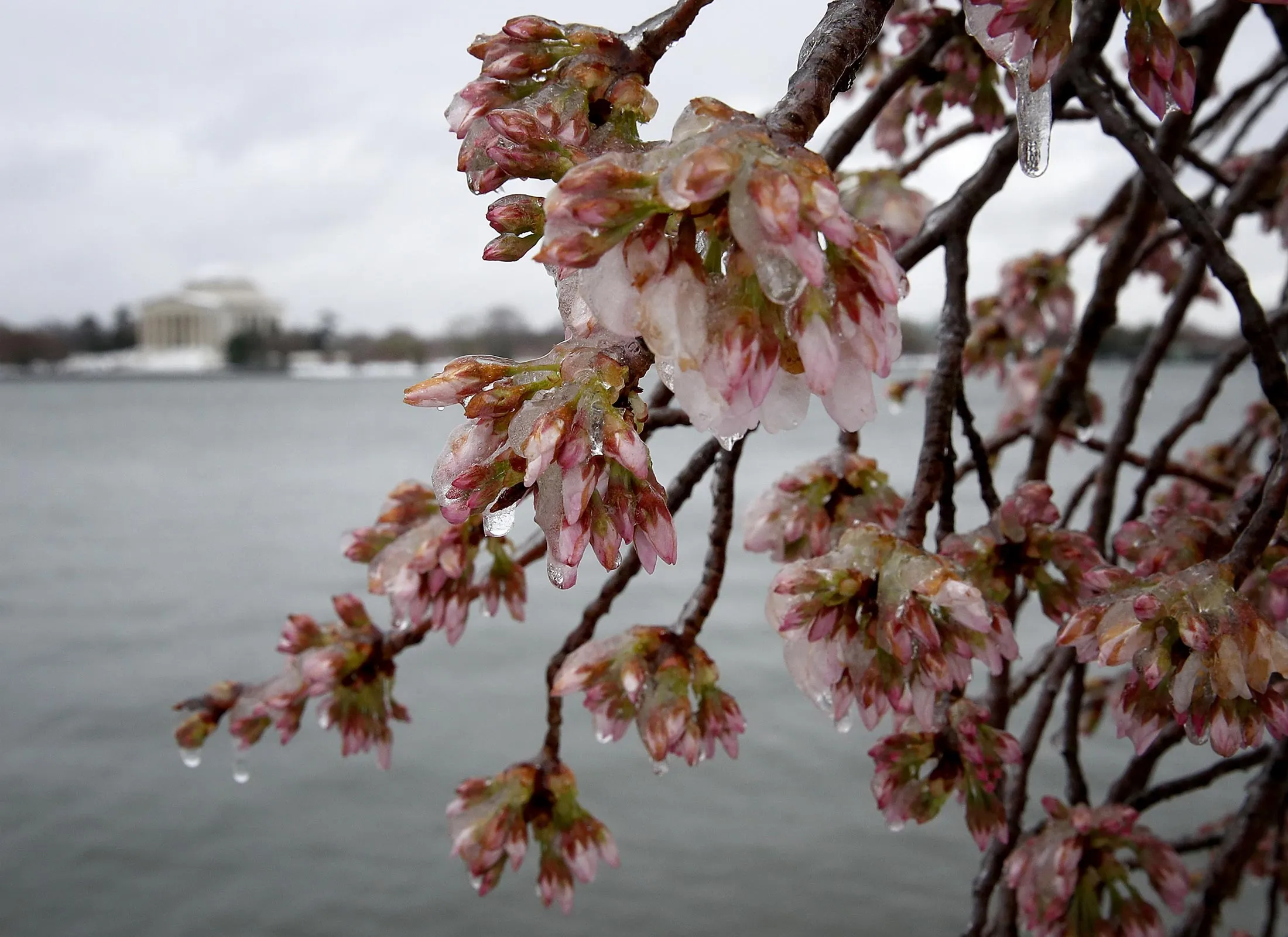 冰雪覆盖了杰斐逊纪念馆附近的樱花,2017年3月14日,暴风雪袭击了国家首都。摄影师:温·麦克纳米/Getty Images然后来了三月的寒意。