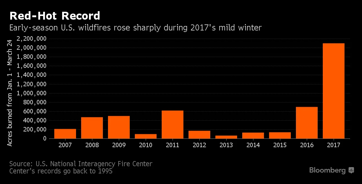 根据美国爱达荷州博伊西的美国国家联邦消防中心,截至今年3月24日,美国已经烧毁了210万英亩,这一数字是十年第一季度平均水平的六倍。许多火灾是人为引起的,但温暖干燥的天气加剧了火势,协调野火扑灭工作的中心发言人杰西卡·加尔德托说。