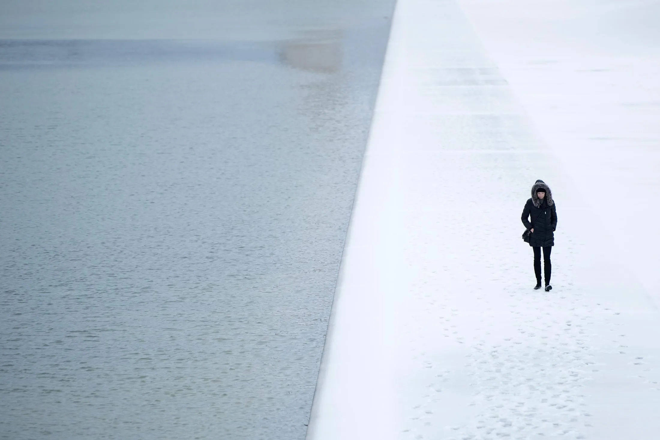 一位游客在2017年3月14日冬季风暴后走过华盛顿特区国家广场的反射池。