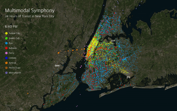 吉里是哥伦比亚大学的数据科学研究生,之前曾涉足 动画化纽约地铁,通过来自 克里斯·黄(出租车!)和 托德·施奈德(出租车和优步!)的先前可视化,他对城市丰富的交通选择产生了兴趣。“但为什么止步于此?”吉里说。“我收集了我能找到的所有纽约交通数据,包括出租车、公交车、地铁、渡轮、Citi Bike、阿美铁道、PATH和Metro-North火车,并将其叠加以制作当前状态的动画。”