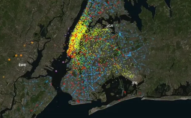 出租车和Citi Bike行程的数据来自2015年的一天,其余大部分数据是通过从各个交通机构下载的时间表获得的。“所以这是根据时间表的静态数据,而不是反映延误或偏离时间表的实时数据,”他说。“还值得注意的是,信息仅在每次出租车和Citi Bike行程的接送地点可用——而不是实际行驶的路线——因此可视化只是从A点到B点画一条直线。”