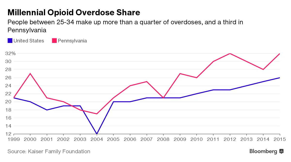 在全国范围内,25至34岁的人群占阿片类药物过量的最大份额,并且根据凯瑟家庭基金会的数据,他们的比例一直在上升。
