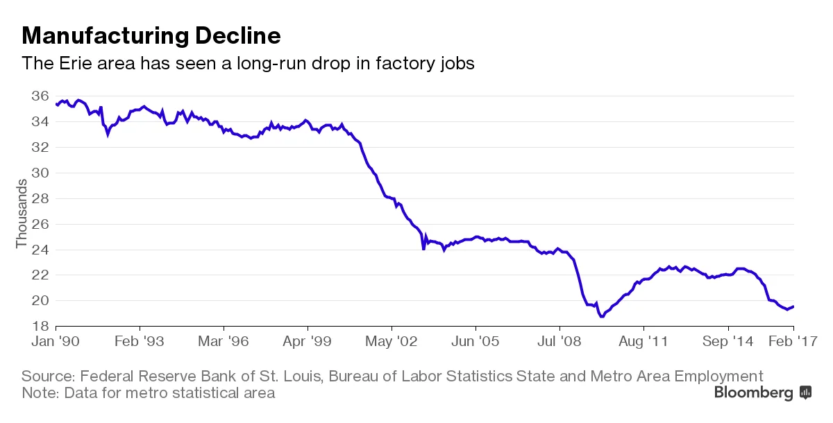 伊利,一个位于同名湖岸边、约有99,500人口的小镇,目睹了其工业基础的侵蚀。摄影师:惠滕·萨巴蒂尼,彭博社这种衰退在伊利深深扎根,约翰逊在这里上学并做了一系列兼职餐厅工作。这个小镇坐落在美国五大湖之一的灰绿色水域旁,自1970年代以来一直在衰退。其人口在2014年首次降至10万人以下,这是自1920年以来的第一次。
