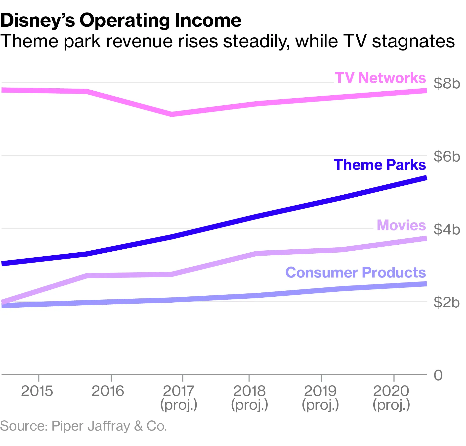 公园在迪士尼的业务中变得越来越重要。电视观众一直在取消他们的有线电视订阅,危及收入来自ESPN、ABC、迪士尼频道和其他资产,这些资产产生了公司大部分的利润。覆盖迪士尼的派珀·杰夫瑞公司的分析师斯坦·迈尔斯预测,到2020年,随着其电视利润的下滑,公园的营业收入将增长64%,达到54亿美元。为了实现这一目标,像潘多拉这样的景点必须真正吸引游客。