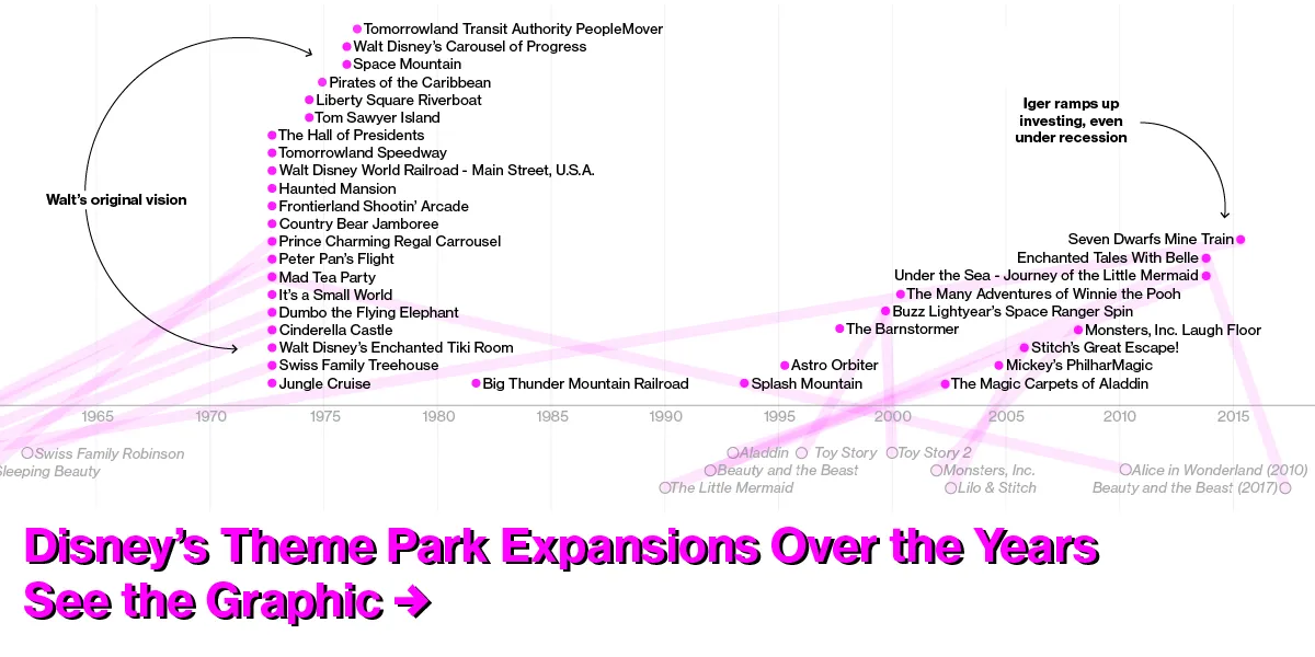刊登于 彭博商业周刊,2017年4月24日至4月30日。 立即订阅。摄影师:斯蒂芬·威尔克斯为《彭博商业周刊》拍摄但即使拥有闪亮的新公园,迪士尼在财务上仍然挣扎。企业掠夺者开始围绕魔法王国盘旋。其中一位,索尔·斯坦伯格,发誓要收购公司并将其拆分,分离公园与电视和电影业务。1984年,迈克尔·艾斯纳被聘为首席执行官,情况有所好转。艾斯纳缺乏沃尔特·迪士尼的创造天才,但他明白公园对公司的业务至关重要。他很快扩展了业务,在1989年于迪士尼世界开设了以娱乐为主题的迪士尼-米高梅影业(现为迪士尼好莱坞影城);1998年在奥兰多开设了动物王国,公司承诺将“为动物园做的事情就像白雪公主与七个小矮人为动画长片所做的那样”;三年后,在安纳海姆开设了庆祝加利福尼亚州的迪士尼加州冒险公园。