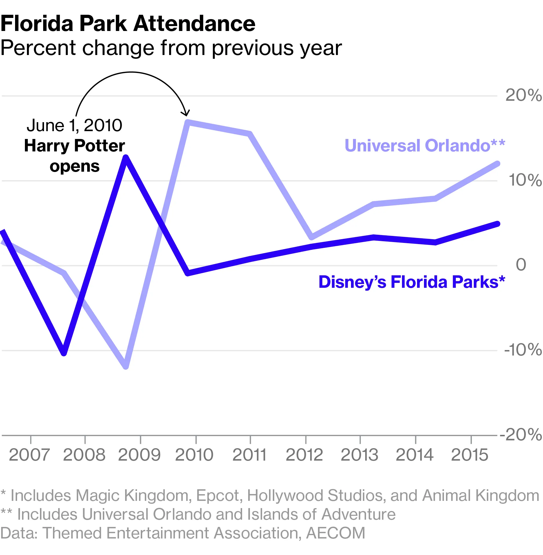 魔法世界为主题公园的创造力设定了新的标准,并使环球在奥兰多的景点有机会超越动物王国和迪士尼好莱坞影城,这两个是迪士尼世界四个公园中表现最差的。“事情真的发生了逆转:迪士尼曾经是领导者。现在迪士尼在跟随环球,”北好莱坞的主题公园设计师加里·戈达德说,他曾为两家公司工作。但他补充道,“在这样做的过程中,他们会尝试超越它。”