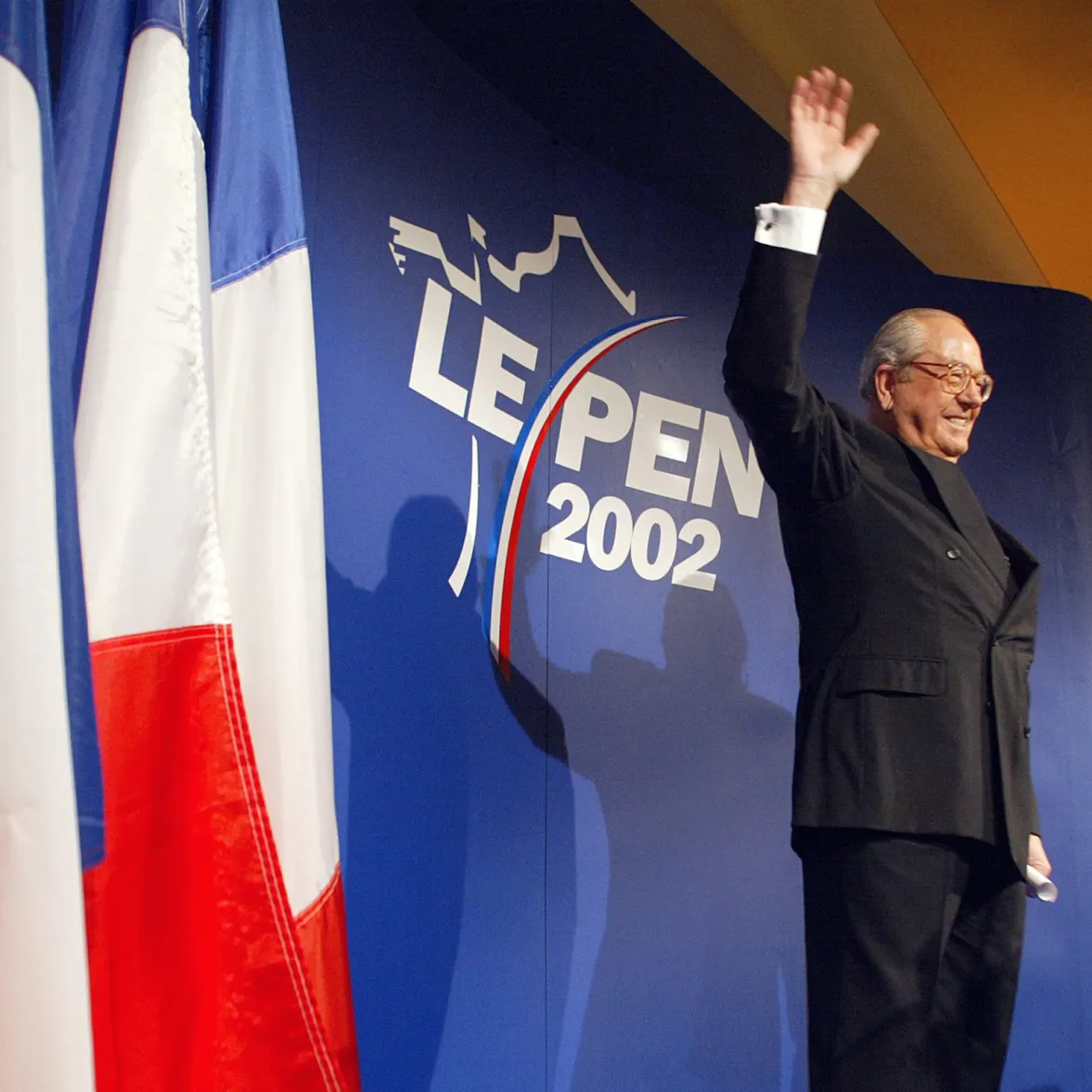 让-玛丽·勒庞在圣克劳德的家中向支持者致意。摄影师:乔尔·萨热/法新社通过盖蒂图片社在让-玛丽在2002年总统选举第一轮中的意外成功使数百万人走上街头抗议后,他在一场大选中被雅克·希拉克击败。