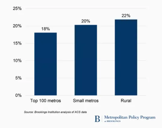 每四个符合EITC资格的白人工人阶级纳税人中就有一个居住在100个最大都市统计区以外的县,而每六个则居住在非都市县(见图2)。事实上,在大多数州,农村地区符合EITC资格的申报者大多数是白人工人阶级居民。例如,在副总统迈克·彭斯的家乡印第安纳州,2015年符合EITC资格的农村纳税人中有55%是拥有高中学历或更低学历的白人工人。