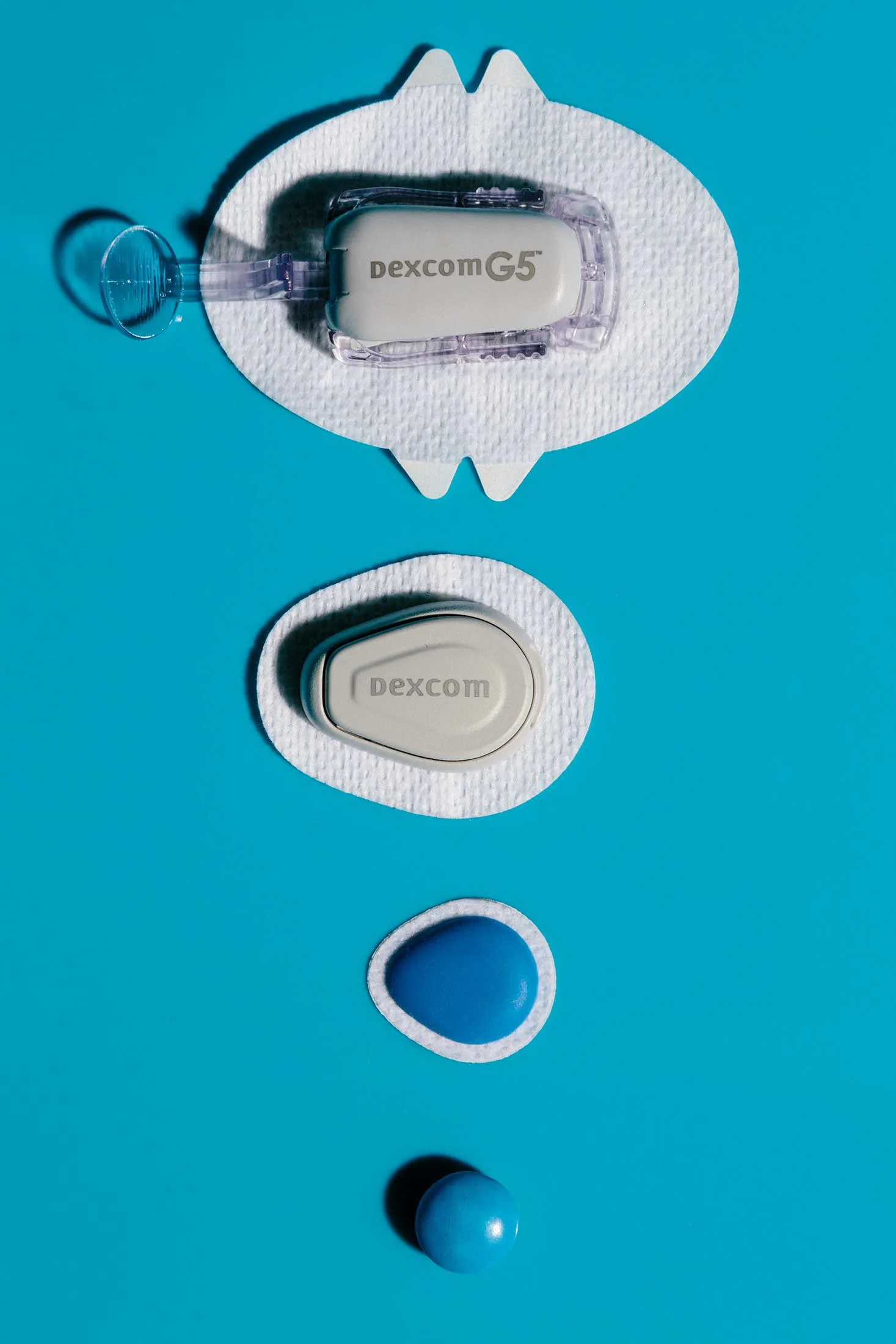 顶部:Dexcom 当前的 葡萄糖 监测器,Verily 正在开发的两个版本,以及一个 M&M 糖果作为尺寸比较。