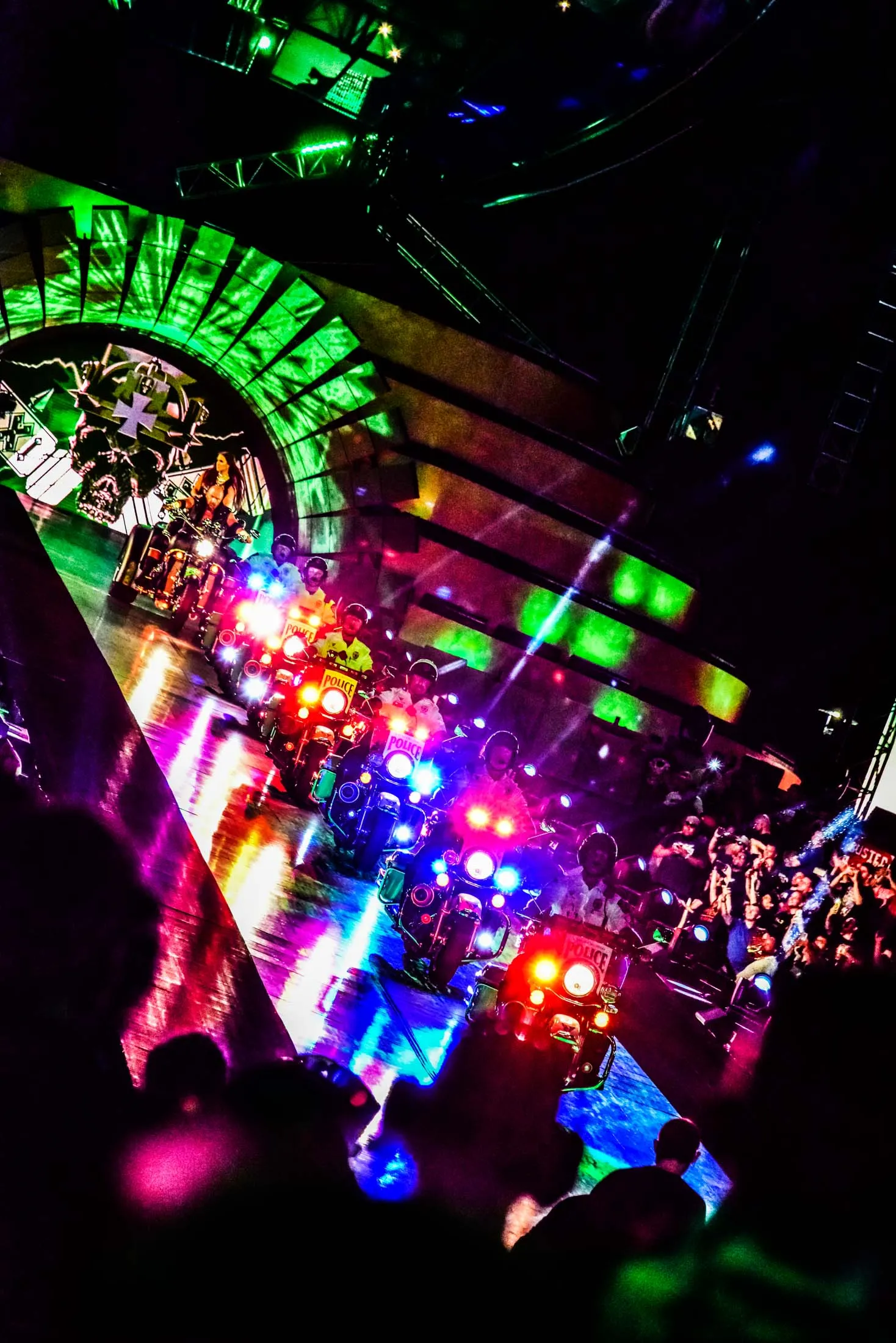 摩托车车队护送三重H和麦克曼前往擂台。摄影师:多莉·法比舍夫,彭博商业周刊