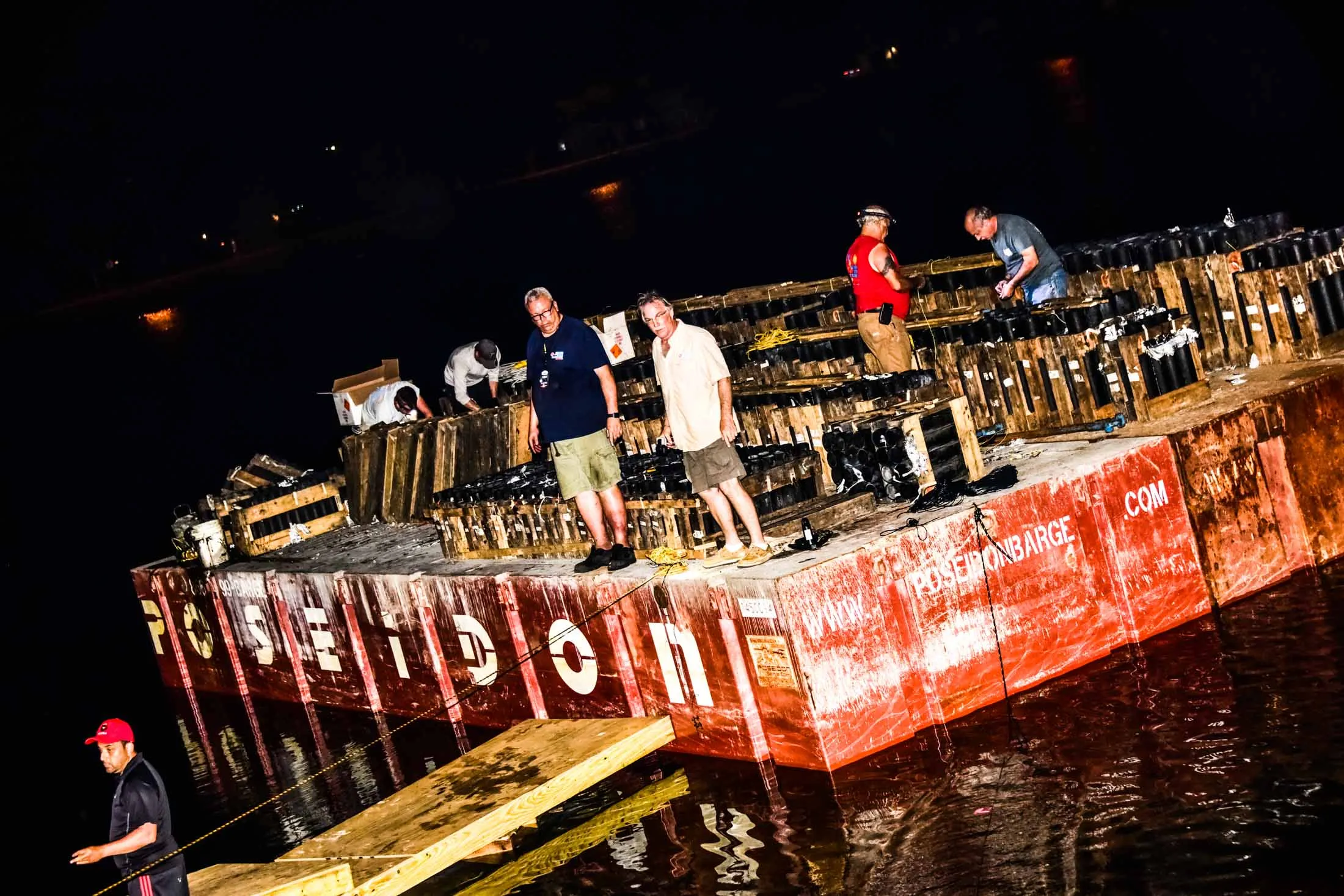 驳船烟花从露营世界体育场外发射。摄影师:多莉·法比舍夫,彭博商业周刊