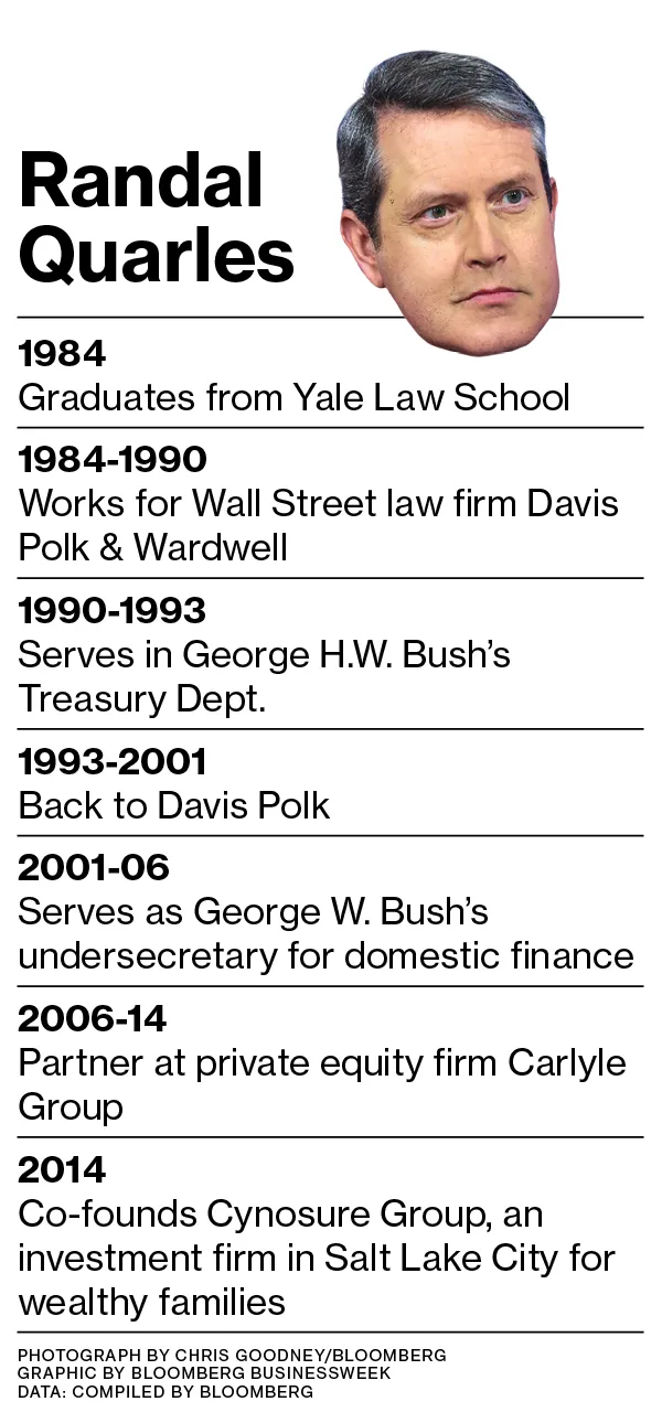 摄影师:克里斯·古德尼/彭博社共和党的民粹主义、结束美联储派不会喜欢特朗普总统在美联储监管银行的重要职位上的选择。兰德尔·夸尔斯,他创办并经营一家名为凯诺索尔集团的犹他州投资公司,是一位华尔街律师,曾为两位布什总统工作,并与强大而富有的埃克尔斯家族的一名成员结婚——也就是马里纳·埃克尔斯,他曾在1934年至1948年担任美联储主席。