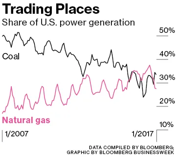 全球的发电厂正在增加对天然气作为燃料的使用,因为它比煤炭燃烧得更清洁——至少在美国,它更便宜。现在,天然气提供了该国约三分之一的电力,十年前仅为17%。