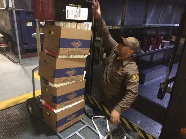 在一个阴雨绵绵的春日下午3点前,基思·格林利夫展示了他的“砌砖”技能。这是送货司机的行话,指的是在金属手推车上平衡过多的纸箱。他把纸箱堆得和锁骨一样高,包装上贴着HP、J. Crew、亚马逊Prime的标签。“这可能是我第一次没有送尿布或狗粮的日子,”他说。