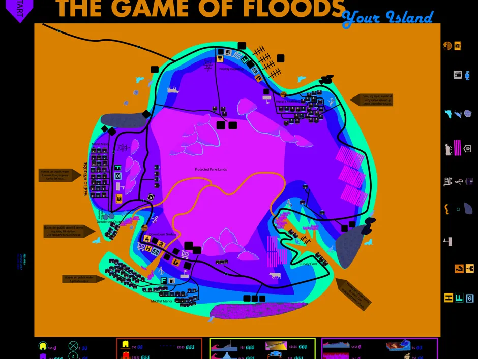 “它可视化了社区中可能发生的事情,并让人们思考选择的影响。”该游戏旨在社区会议或研讨会上进行,洪水游戏邀请居民扮演规划委员会成员,权衡适应策略与假设的“马林岛”未来的极端潮湿。它是一种资源管理游戏,风格类似于 卡坦岛的开发者:有一个六边形的游戏板,上面色彩斑斓地标示着洪水区域;玩家选择他们承诺保护的社区“资产”,例如海鸟栖息地、停车场或电力变电站。