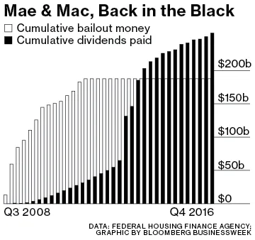 当政府接管它们时,房利美和房地美向财政部发行了一种新的优先股,支付10%的股息,并附带几乎80%公司普通股的认购权证。在2012年,政府改变了条款,规定房利美和房地美每个季度将所有利润都交给财政部,除了保留的一定金额。这笔储备金在2013年起始为30亿美元,并计划在随后的每一年减少6亿美元,直到2018年降至零。