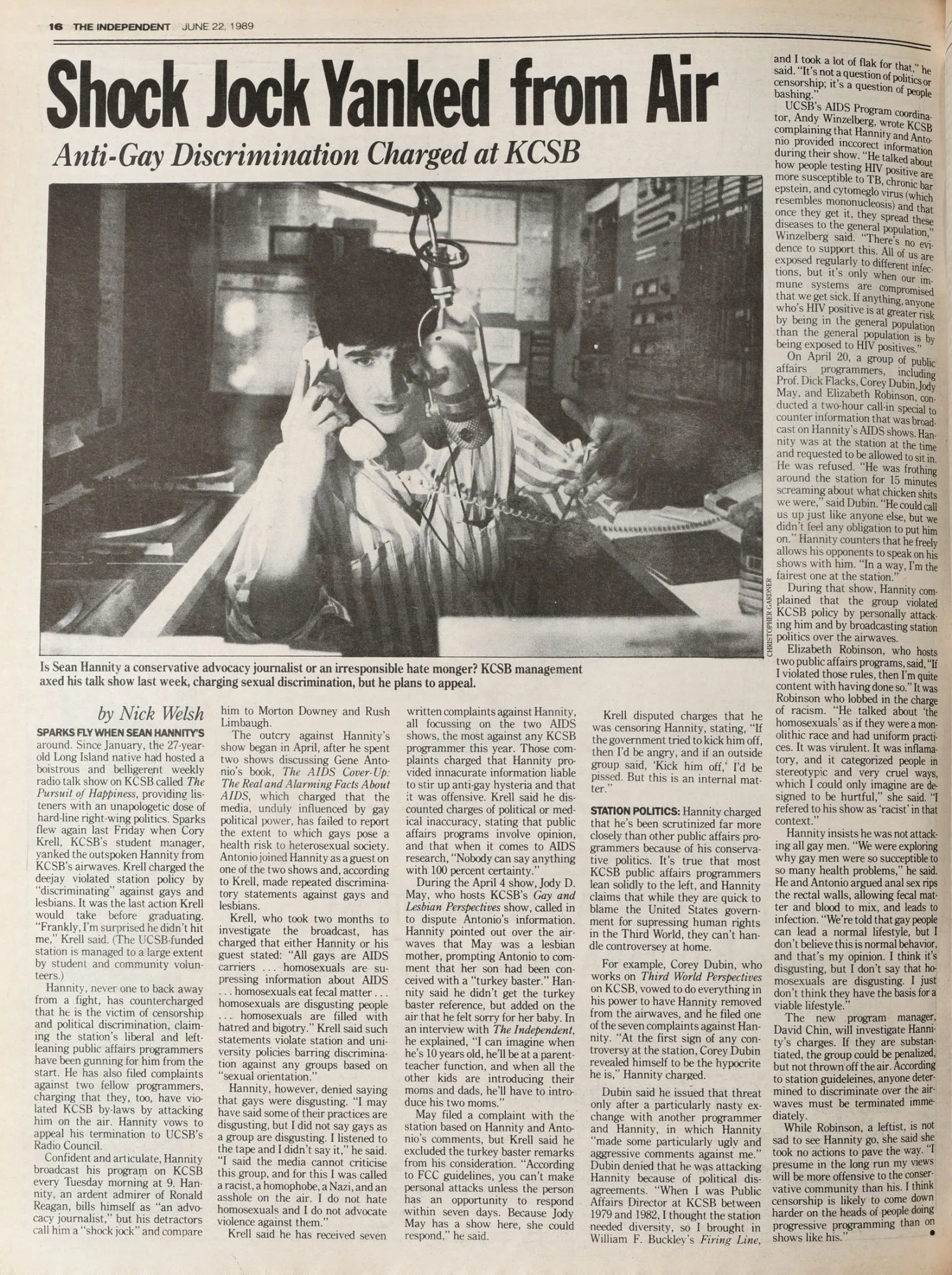 摘自圣巴巴拉独立报,1989年。来源:圣巴巴拉独立报汉尼提在附近的监视器上观看。那天,自由派民主党人帕特里克·哈尔平代替科尔梅斯。“汉尼提转向我,摇了摇头,说了句‘你能相信这个家伙吗?’”哈尔平回忆道。“他看起来完全厌恶。”