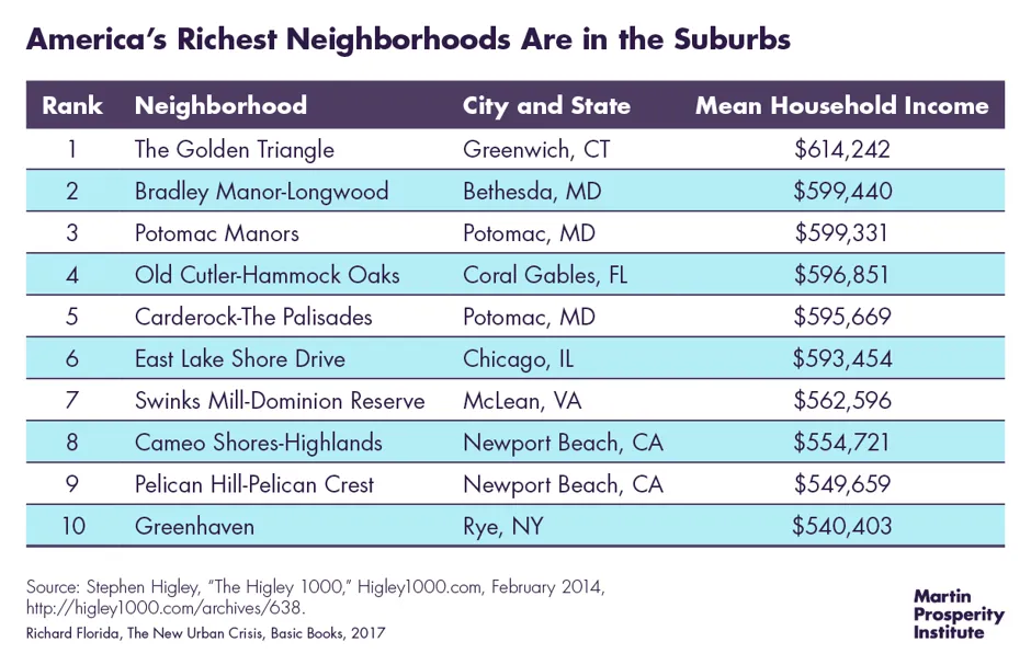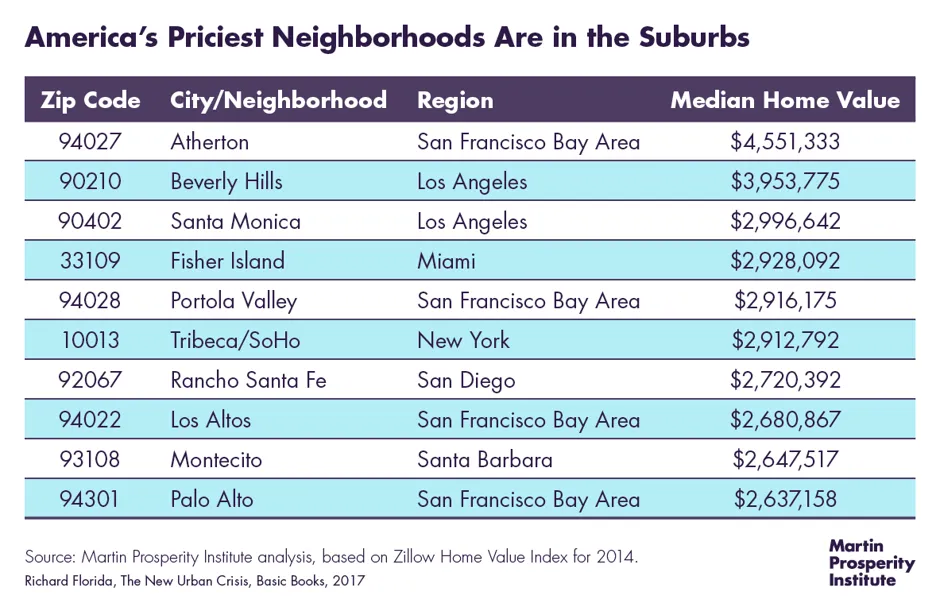 美国的 十个最昂贵的邮政编码中,除了一个,其余都位于郊区——唯一的例外是纽约的Tribeca/SoHo。十个中有八个在加利福尼亚州,包括精英的硅谷郊区Atherton、Los Altos和Palo Alto,以及比佛利山庄和圣莫尼卡、圣地亚哥的Rancho Santa Fe,以及圣巴巴拉的Montecito。只有通过船或渡轮才能到达的Fisher Island,位于迈阿密海滩附近的比斯坎湾。郊区是日益增长的不平等的场所,并且越来越受到自身深刻阶级分化的困扰。
