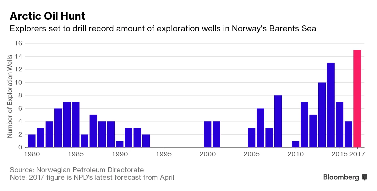 挪威当局预计包括Lundin Petroleum AB和OMV AG在内的公司将在巴伦支海钻探创纪录的15口井。Statoil ASA的Songa Enabler,一种相当于两个足球场大小的浮动钻机,正处于这些努力的前沿,开始进行五口井的勘探活动。