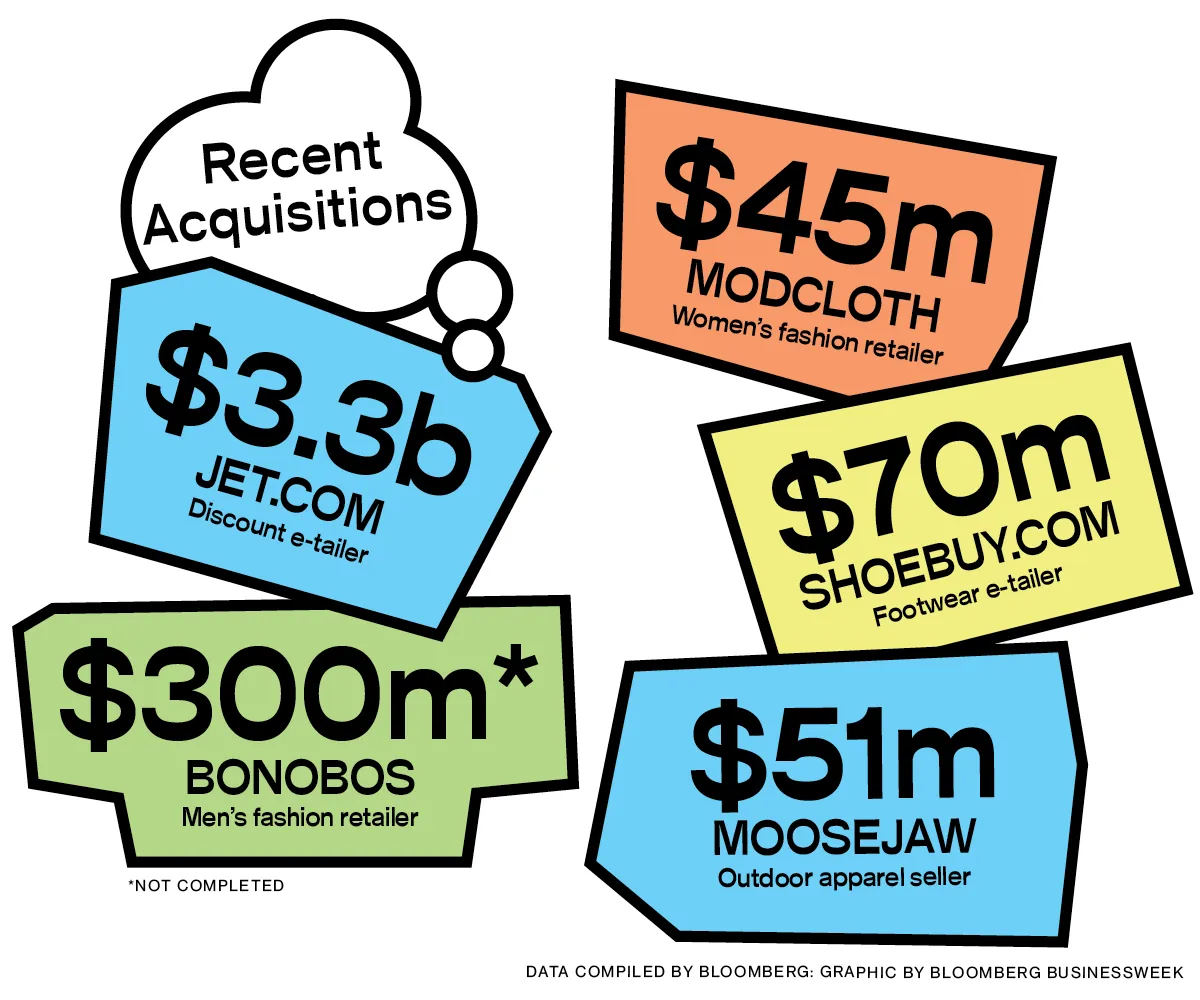 整个战略的核心是一场收购狂潮:收购中等规模的电子商务初创公司,如Shoebuy.com(7000万美元)、时尚零售商ModCloth(4500万美元)和户外服装销售商MooseJaw(5100万美元);将他们的创始人任命为他的副手;并在Walmart.com上销售他们的产品,尽管选择仍远远落后于亚马逊。今年春季晚些时候,Lore还可能会宣布沃尔玛据报3亿美元收购Bonobos Inc.,这是一个已有十年历史的男装网站,提供合身的裤子和一支热情的客户服务团队——Bonobos称他们为“忍者”——这在像沃尔玛这样的大公司中并不常见。
