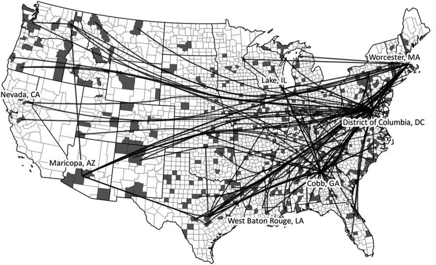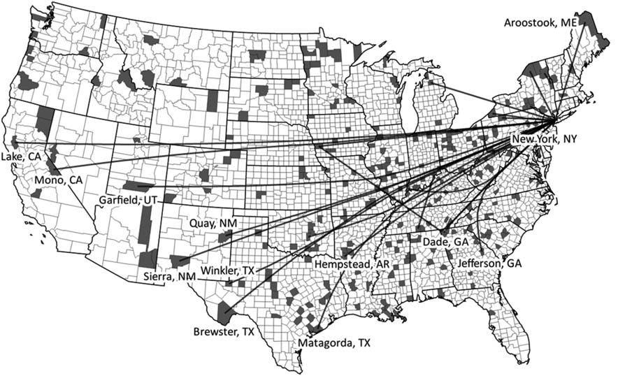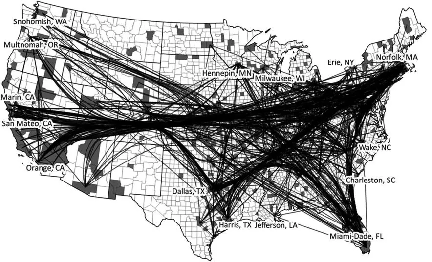 王、麦克和马切维耶夫斯基/美国地理学会年鉴根据作者的说法,第三个社区展示了三个关键节点县:弗吉尼亚州的亨里科县、田纳西州的威廉森县和旧金山。但地图也展示了西海岸县的影响力,如圣克拉拉、洛杉矶和波特兰地区,这些地区与德克萨斯州、伊利诺伊州、佛罗里达州、弗吉尼亚州和宾夕法尼亚州的主要人口中心相连。