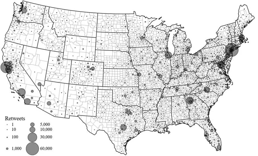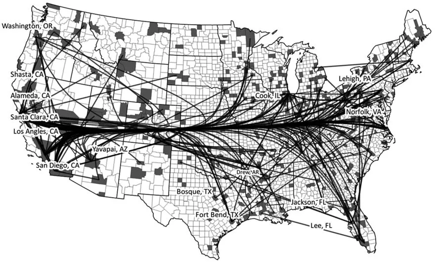 大约四分之一的推文(159万条)包含这些标签,研究最终将其样本用户缩减到89,914个具有可追踪县级位置信息的用户。通过网络分析、社区检测和回归技术,研究追踪了推特用户和转发用户之间的流动链接。