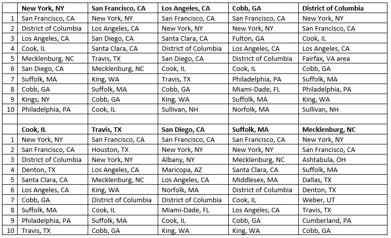 全国创业转发的地图。王、麦克和马切维耶夫斯基/美国地理学会年鉴上面的地图绘制了他们在美国各地关于创业的推特活动。注意波士顿-纽约-华盛顿走廊、大湾区、洛杉矶和西海岸的西雅图,以及芝加哥、达拉斯和休斯顿、亚特兰大和迈阿密周围的大量活动集群,这主要 反映了国家的主要人口中心。下一个图表显示了与创业相关的推特上转发最多的10个县,随后是与这些主要中心通过转发最频繁互动的十个县的排名。