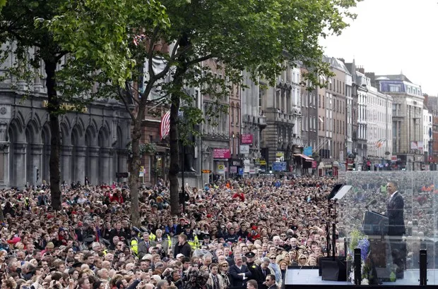 奥巴马总统在2011年于大学绿地发表演讲。卡萨尔·麦克诺顿/路透社新的效果图展示了改造后空间的美好前景(施工计划于2018年1月开始)。虽然三一学院将被新的电车轨道包围,但广场的其余部分将被开放为一个单一的花岗岩铺成的区域,使周围的建筑能够“呼吸”,并为多达15,000人的人群提供空间。自行车将被限制在边缘,广场粗糙的鹅卵石希望能阻止骑自行车的人走斜线捷径。水喷泉将在爱尔兰银行前面喷涌而出。为了实现这一切,出租车将被重新引导到邻近的街道,而公交车将被要求在空间的一端停靠并掉头。