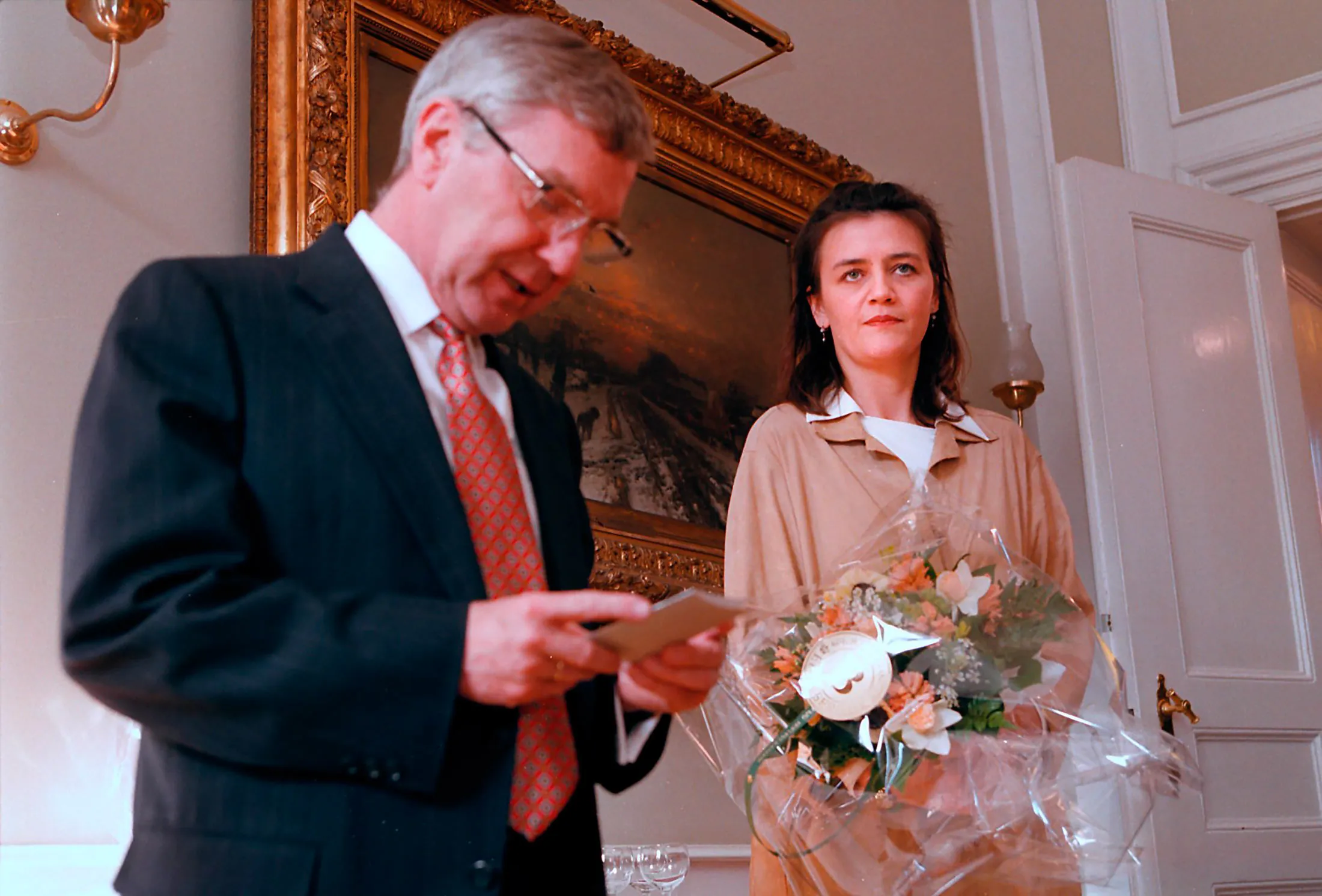 作为教务部长被介绍,1998年。摄影师:Scanpix/Sipa USA维斯塔格表示,苹果案在原则上与其他任何国家援助调查没有区别。她表示,苹果超过140亿美元加利息的税单引起了强烈关注,“因为这是一个大数字,而且这是一个大家都知道的公司。”没有任何国家援助裁决曾导致如此巨大的回收。在2016年3月给维斯塔格的信中,库克写道他对“这些程序的公平性感到担忧”;当决定宣布时,苹果和爱尔兰迅速提出了上诉。这笔钱将被存入托管账户,直到欧洲法院作出最终决定,这一过程可能需要数年。