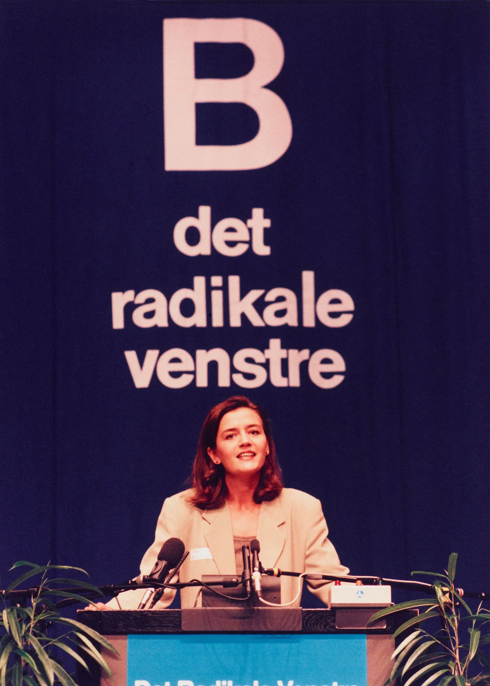 在Radikale Venstre演讲,1994年。摄影师:Annelise Fibaek /Polfoto/RitzauVestager于1988年开始她的政治生涯,20岁时为Radikale Venstre工作——直译为“激进左派”,尽管该党通常被视为社会自由派。它的原则是中间派,倾向于经济保守主义。这个党小而成立超过一个世纪,最快乐的时刻是在议会联盟中扮演关键角色,并沉迷于政策研究。Vestager的外曾祖父帮助创立了该党,她的父母都是成员。她的母亲曾竞选国会,但未能成功,她的父亲在尤兰半岛的瓦尔德市的市议会任职。两人都是路德宗牧师,他们的家门对任何想要来寻求建议或精神支持的人敞开。“他们非常参与当地社会,”Vestager说。“这是我得到的信息,并带着它。”