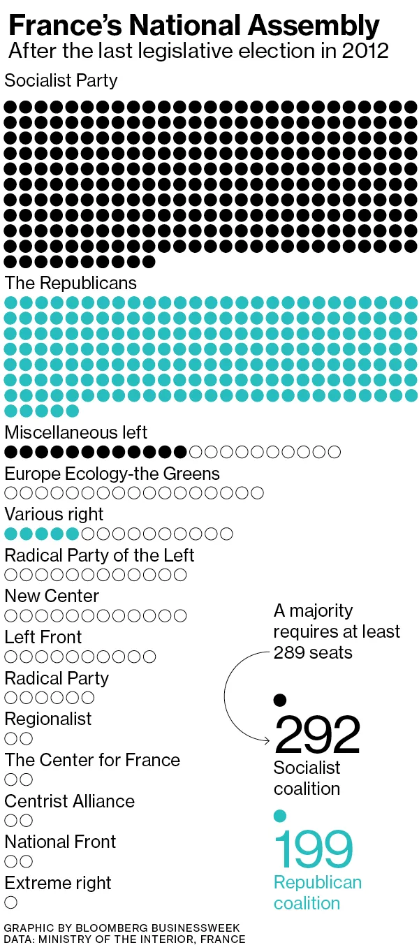 在选举后的第二天,马克龙的政党表示将 更改其名称 从“前进!”(On the Move!)为“前进共和国!”(La République en Marche!),以反映它不再是其领导人的个人工具。马克龙定于5月14日宣誓就职,他誓言将在法国的577个选区中竞争,政党表示将于5月11日宣布完整的候选人名单。在总统选举的第二轮之前,民调机构OpinionWay S.A.S.发布了一项调查,表明马克龙的政党在国会中将略微低于多数,因此他可能需要与中右派的共和党或社会党形成联盟。5月8日的一项Ipsos民调显示,61%的选民不希望马克龙在国会中赢得多数,因为他在第二轮中的大部分支持来自那些更关心阻止勒庞上任而不是支持他计划的人。“我看不到明确的多数出现,”民调公司Ifop SA的意见部门负责人杰罗姆·福尔凯特说。“我们可能正朝着一个无法治理的局面前进。”