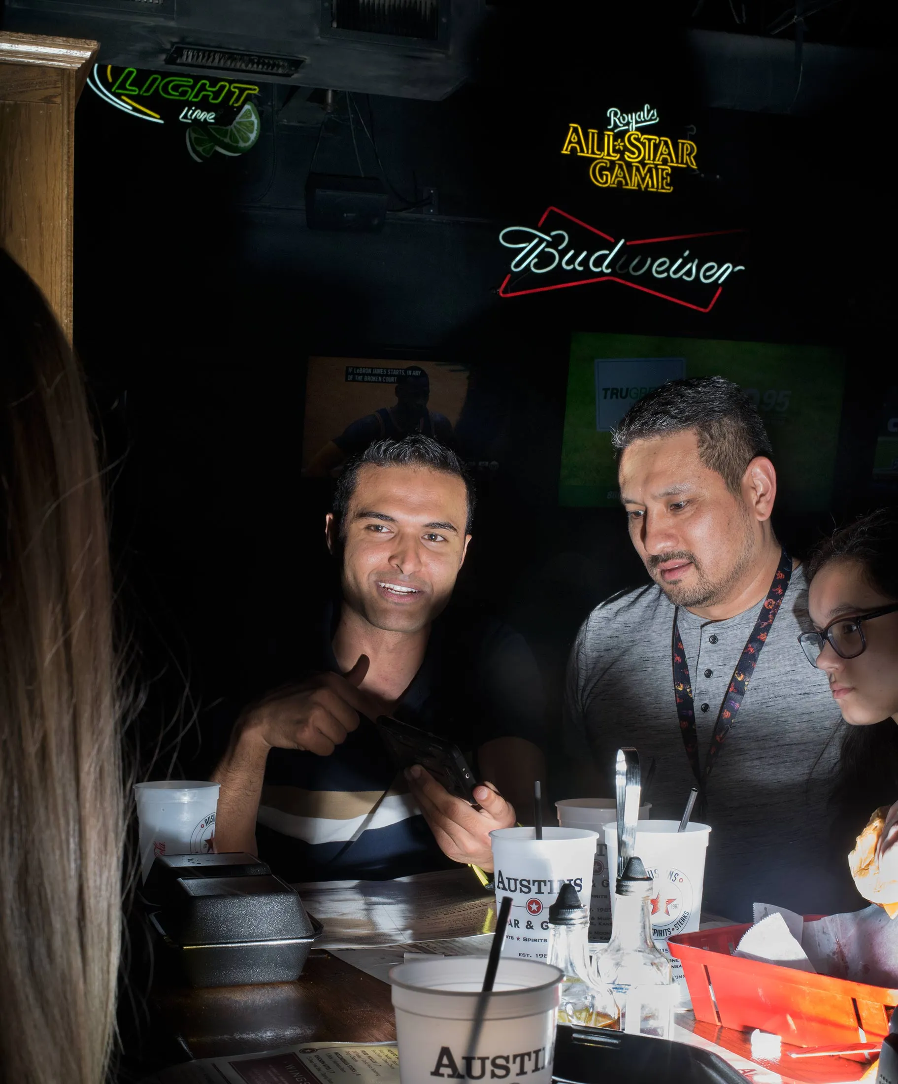 奥斯汀酒吧位于一个购物中心停车场的角落,外面露台上方悬挂着一个大型的绿色和红色标志。酒吧内部几乎每一寸墙壁都挂满了显示体育赛事的电视,无论是什么时候。最近一个星期三的下午5点过一点,酒吧已经开始热闹的欢乐时光营业,座位上坐满了各类白领经理、建筑工人和佳明公司的员工。在入口附近的一张高桌子旁,来自印度科钦的企业家马诺杰·乔治(Manoj George)正在喝啤酒,他自2003年以来一直住在奥拉西,惊叹于当地人对库奇博特拉被杀事件的反应。成千上万的市民参加了由社区团体、教堂和学校组织的烛光守夜和跨宗教聚会。堪萨斯城印度协会在奥拉西的巴尔会议中心举办的一次活动吸引了如此多的人,以至于组织者不得不在停车场设置扬声器。乔治的妻子是第五代奥拉西人,他说,在奥斯汀对面的天主教堂举行的守夜活动中,他看到了一些朋友,他们并不认识受害者或其他印度人,但来这里与乔治共鸣,并表达对这起犯罪的厌恶。