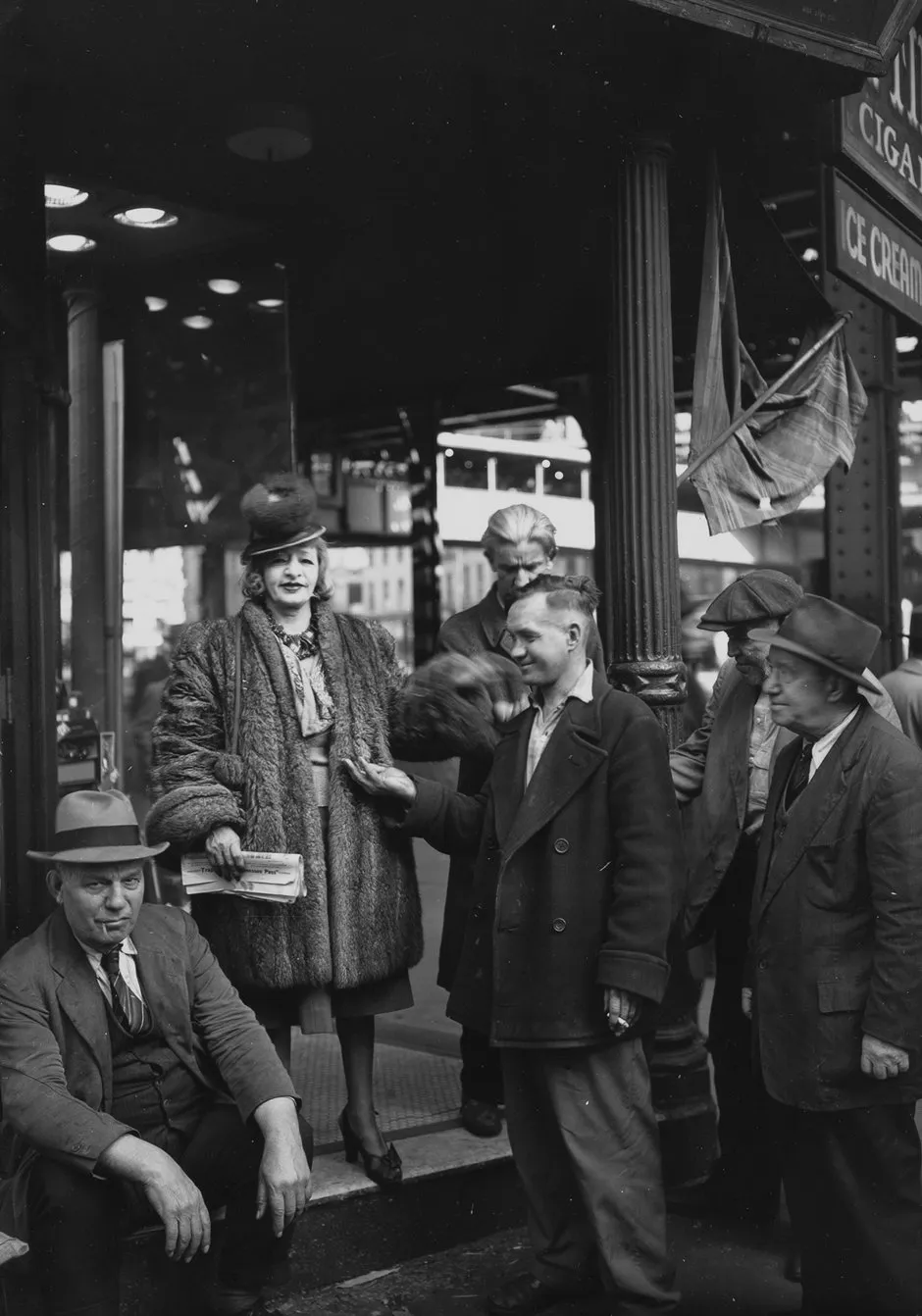 我走在第三大道上到博华里,看到一个惊人的女人。她是漂白金发,化着浓妆,真的很糟糕。一个流浪汉坚持让我给他拍照,当她同意时,我架起了我的相机 […] 结果发现她是梅齐 [sic],博华里的女王,而这个笑话是流浪汉想让我拍她给他一角钱的样子。她每天都在博华里走,给那些失落的人发一角钱。(1946年3月27日)