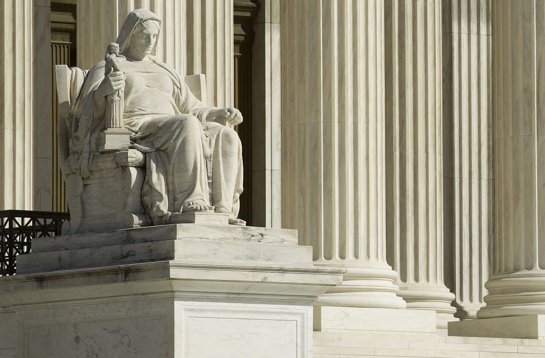 正义的沉思雕像坐落在华盛顿特区最高法院大楼前。