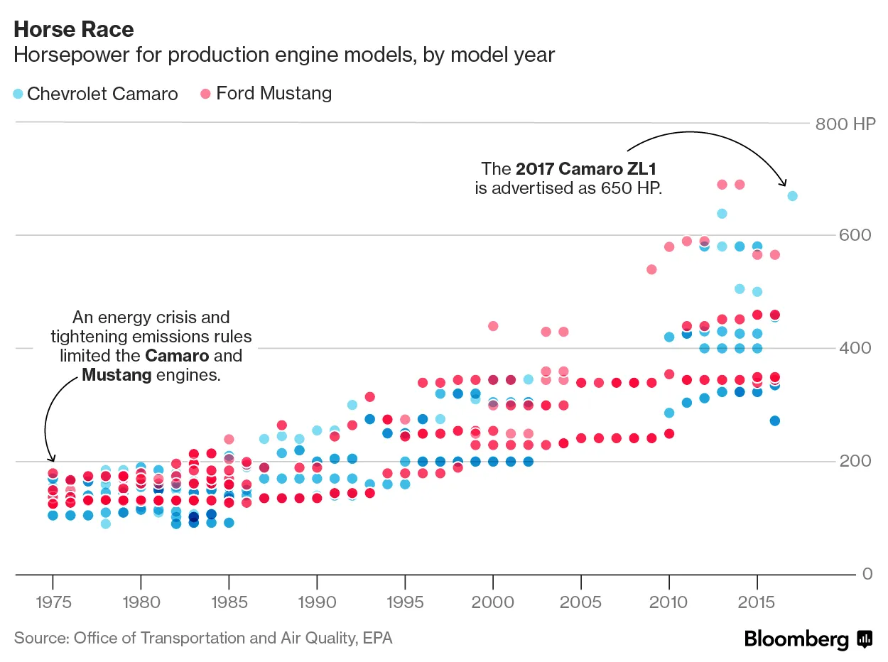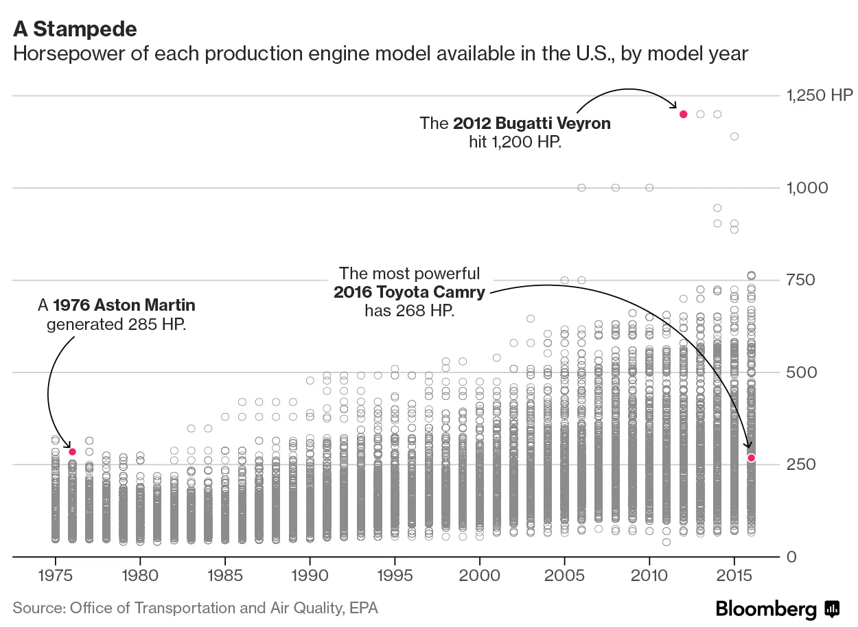 如果一个 1976 年的司机能够以某种方式获得一辆 2017 年的汽车,他将面临严重的鞭打伤风险。自那时以来,美国的马力几乎翻了一番,中位车型从 145 马力上升到 283 马力。不出所料,整个美国车队在参加拖车比赛时变得更加有竞争力:车辆从 0 加速到 60 英里每小时的中位时间减半,从近 14 秒降至 7 秒。