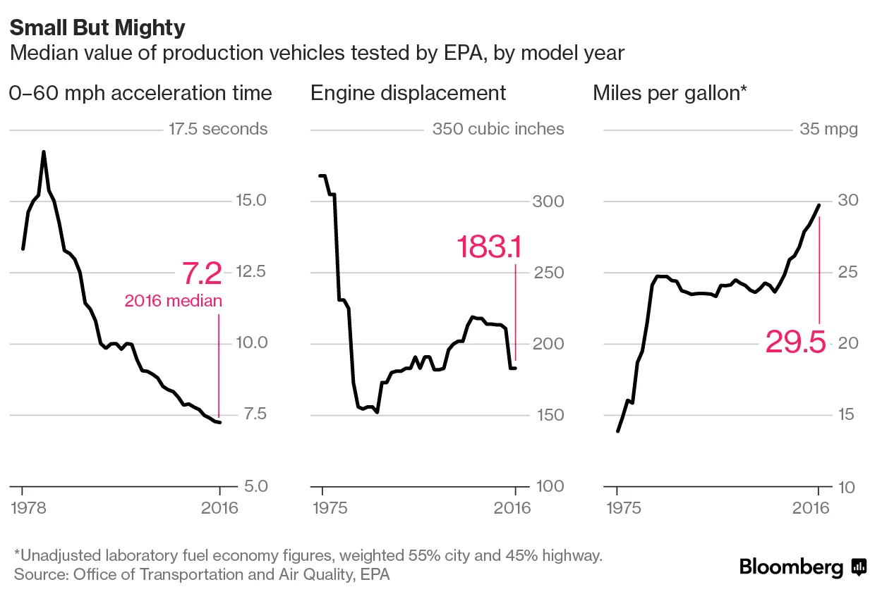 美国道路上的内燃机比40年前小约42%。与此同时,环保署的每加仑行驶里程的中位数已经翻了一番,从15提高到30。这些增益大多是在联邦效率法规的压力下取得的。伟大的动力推动始于1985年,当时行业刚刚达到每加仑27.5英里的门槛。
