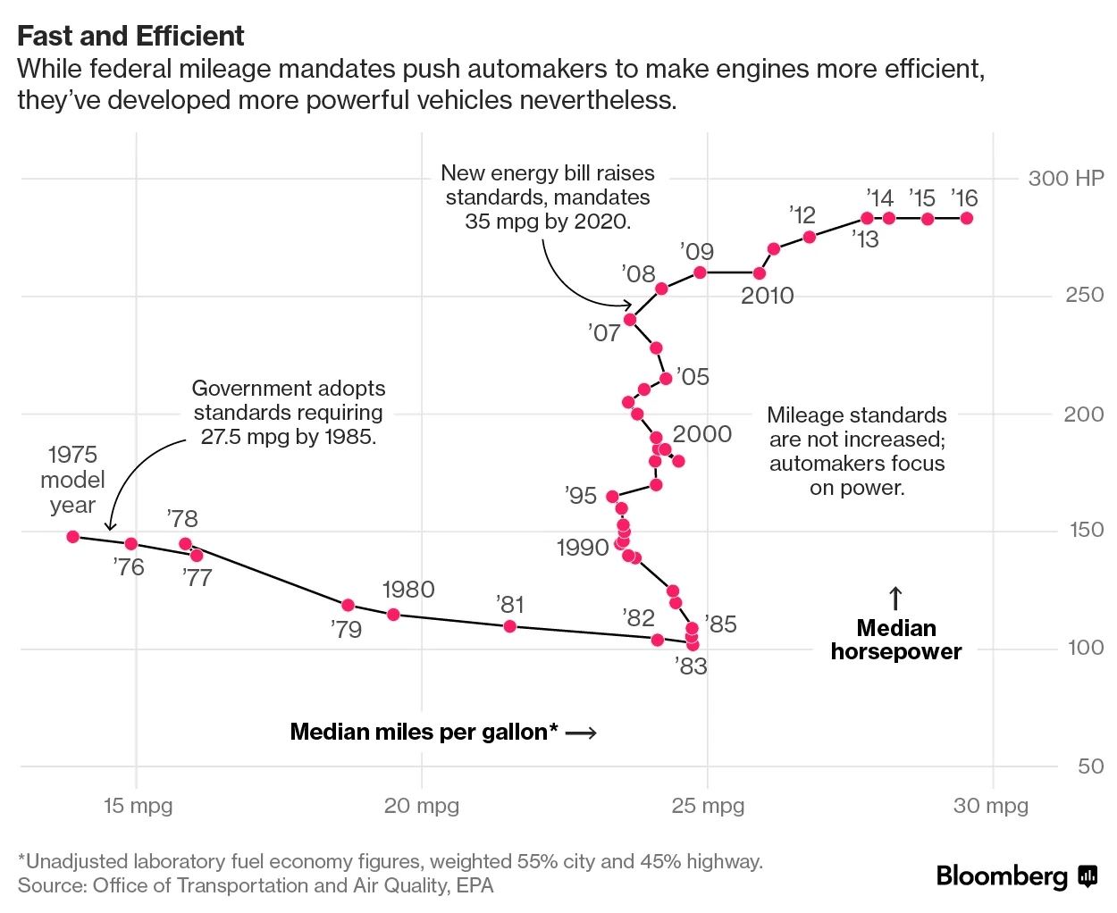 从2007年开始,车辆又实现了一次效率飞跃,当时一项新的能源法案设定了每加仑35英里的门槛。然而,这一次,汽车制造商不断增加动力。