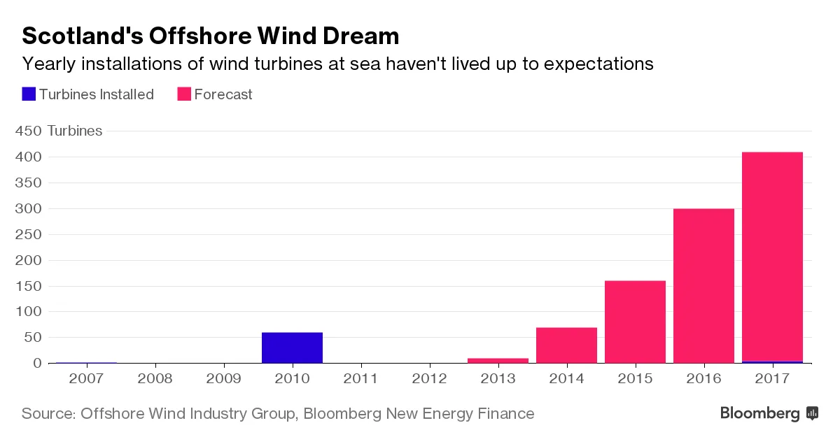 在2011年,当苏格兰民族党赢得压倒性选举胜利时,政府预测海上产业可以创造多达28,377个就业机会,并在2020年时价值高达71亿英镑(91亿美元)。到目前为止,这些工作中不到十分之一实现,只有大约500人在苏格兰的海上风电领域工作,根据国家统计局的数据。