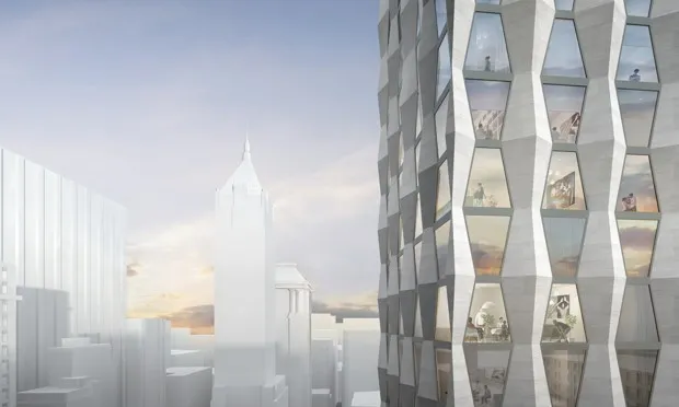 这些设计可能不会让人联想到爵士乐和地下酒吧,但它们确实引人注目。Hollwich Kushner 对于 One Wall Street 的回应,这座宏伟的 1931 年塔楼,将建筑的退缩转化为锯齿状的玻璃和石灰石面板,并将原本坚固的顶部溶解成一个破碎的顶点。位于切尔西的 16 层办公楼 214 West 29th Street,其层次被平滑成一个统一的整体,倾斜的墙壁和突出的垂直肋条吸引着视线向上移动。不出所料,“New(er) York” 中的投机性建筑呼应了 其他 项目,这些项目均由该公司设计。