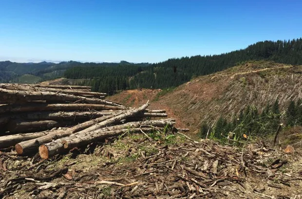 2016年俄勒冈州埃利奥特州立森林的清除砍伐山丘。吉姆·坦纳/路透社在“景观”中的清除砍伐区域从浅棕色到浅绿色再到深绿色,代表了从原始土壤到灌木和小灌木再到年轻的落叶和针叶森林的生命周期。太平洋西北地区的伐木发生在私人和公共土地上,但主要是在私人土地上——这一事实在清除砍伐作业在某些政治边界处遇到障碍时显而易见。例如,查看0:25的动画,看看移除的生物量(以黑色表示)如何在雷尼尔山国家公园的边缘停止,就好像被一条由持枪的洛拉克斯守卫的无形围栏所排斥。(当然,覆盖着雪的山峰仍然完全没有生物量。)