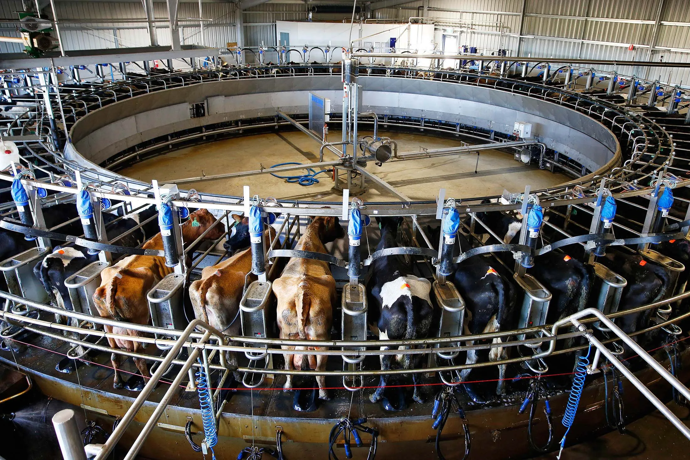 在塔斯马尼亚,由中国拥有的范迪门土地公司的奶牛场内的旋转挤奶棚。摄影师:布伦登·索恩/彭博社2016年3月,月湖投资有限公司以2.8亿澳元(2.1亿美元)收购了澳大利亚最大的奶业公司范迪门土地公司,计划利用该岛的“清洁和绿色”形象,将新鲜牛奶直接运送到中国东部的宁波。