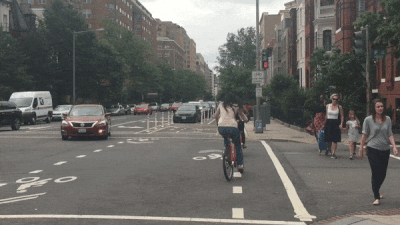 另一种合法的跳灯技巧使用“领先行人间隔”,让行人在斑马线前比汽车提前起步。在华盛顿特区,自行车可以在这个宽限期内跳跃,而在此期间它们本应是逆向行驶的交通。这给骑自行车的人提供了在汽车进入交叉口之前转弯的机会。