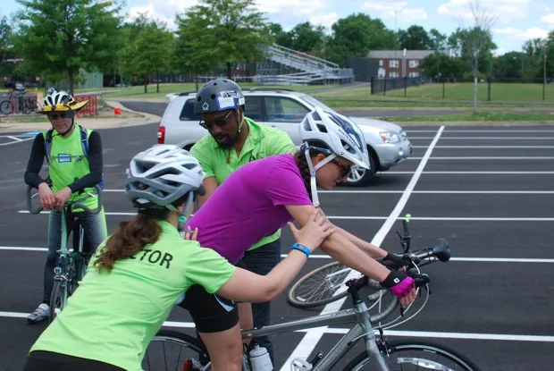 一名学生使用正确的脚步执行快速转向,以便将自行车远离迎面而来的汽车。华盛顿地区自行车协会“要做好这一点,你必须承诺让你的自行车倾斜,”道格说。“你会对倾斜感到更舒适,但每个人在直立时都很舒适。”不过,一旦人们掌握了这个动作,道格的学生们最喜欢练习这个。“这是一个有趣的演练,”他说。此外,他还说,**“**自行车的一个好处是轮胎非常抓地,你可以倾斜并仍然保持摩擦力,重新保持直立。”