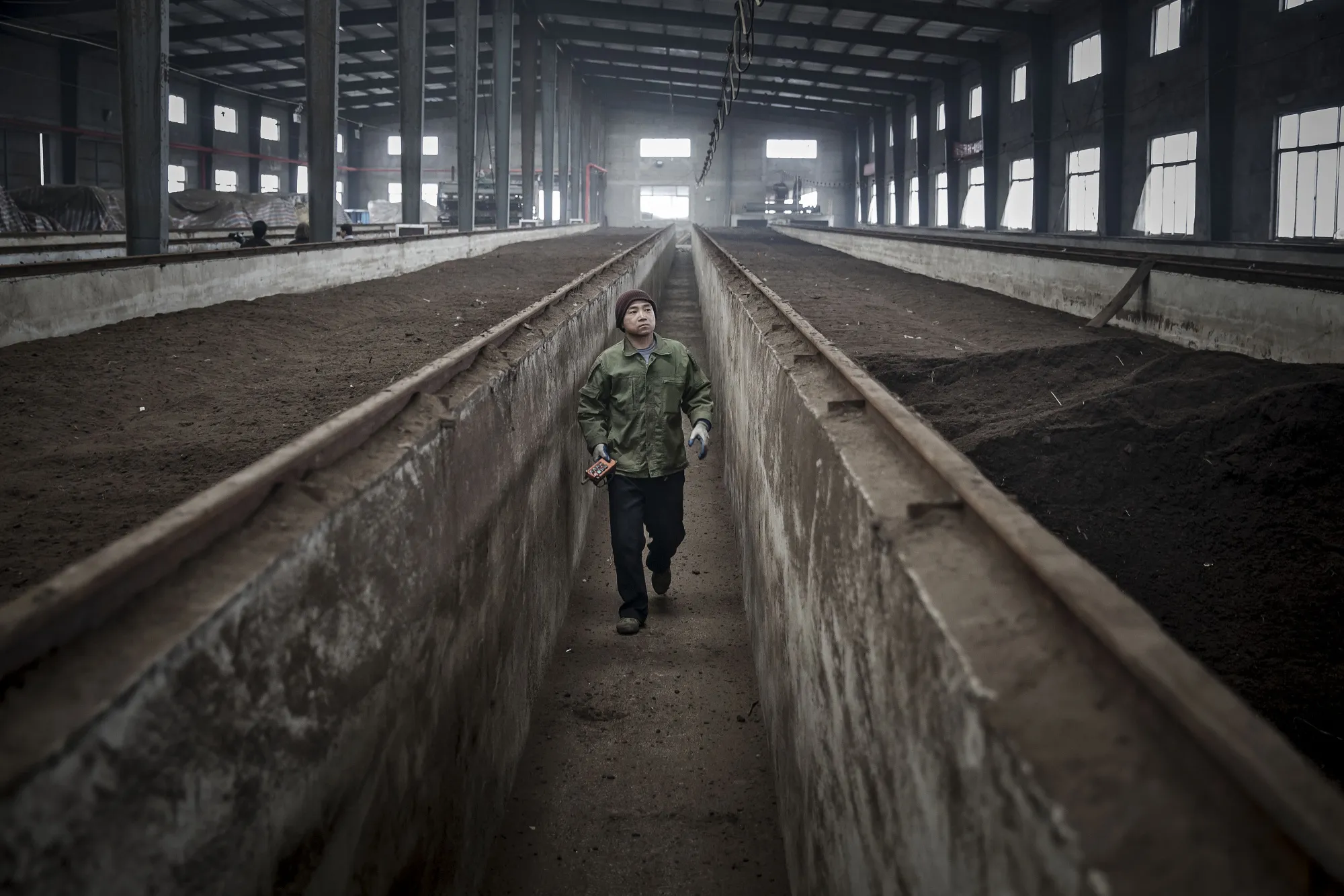 动物粪便在圈舍中发酵,何生将其转化为有机肥料。摄影师:沈启来/彭博社其中一个农场位于山东省烟台,位于一个以葡萄园闻名的半岛,突入黄海。由蓬莱何生农业科技发展有限公司运营,按中国标准来说,它是巨大的。该公司租赁了70,000公顷土地,雇佣了400名工人。该项目包括一个食品加工单位、一个种马场和一个每年生产80,000瓶的葡萄园。