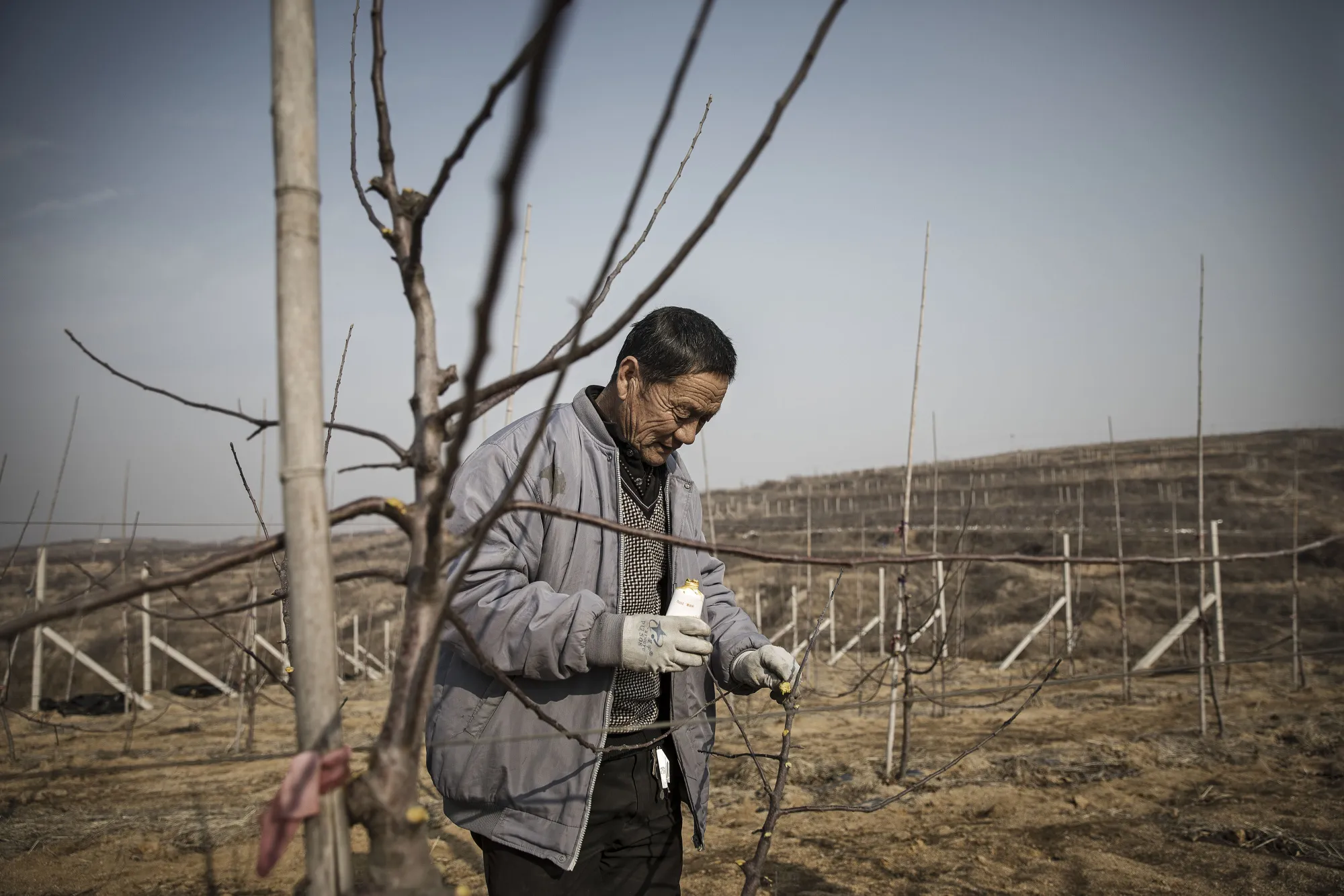 药膏涂抹在何生农场修剪过的苹果树枝上,该农场种植了数十种水果和作物。摄影师:沈启来/彭博社了解更多关于:中国的全球食品足迹 微型农场 食品巨头 食品技术